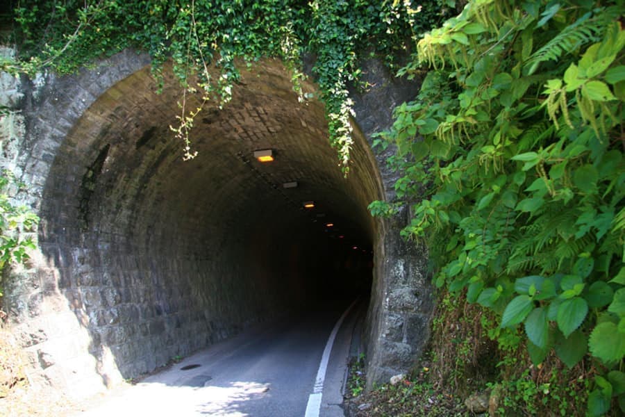 かつて岩盤を切り開いて線路を敷いた区間が長く幅の狭い山道になっていて、道の脇にプラットホーム跡が残っていたり、狭い鉄道トンネルを車でくぐれる場所があったりと、ところどころに当時の面影が残り、不思議な魅力を感じる道です。